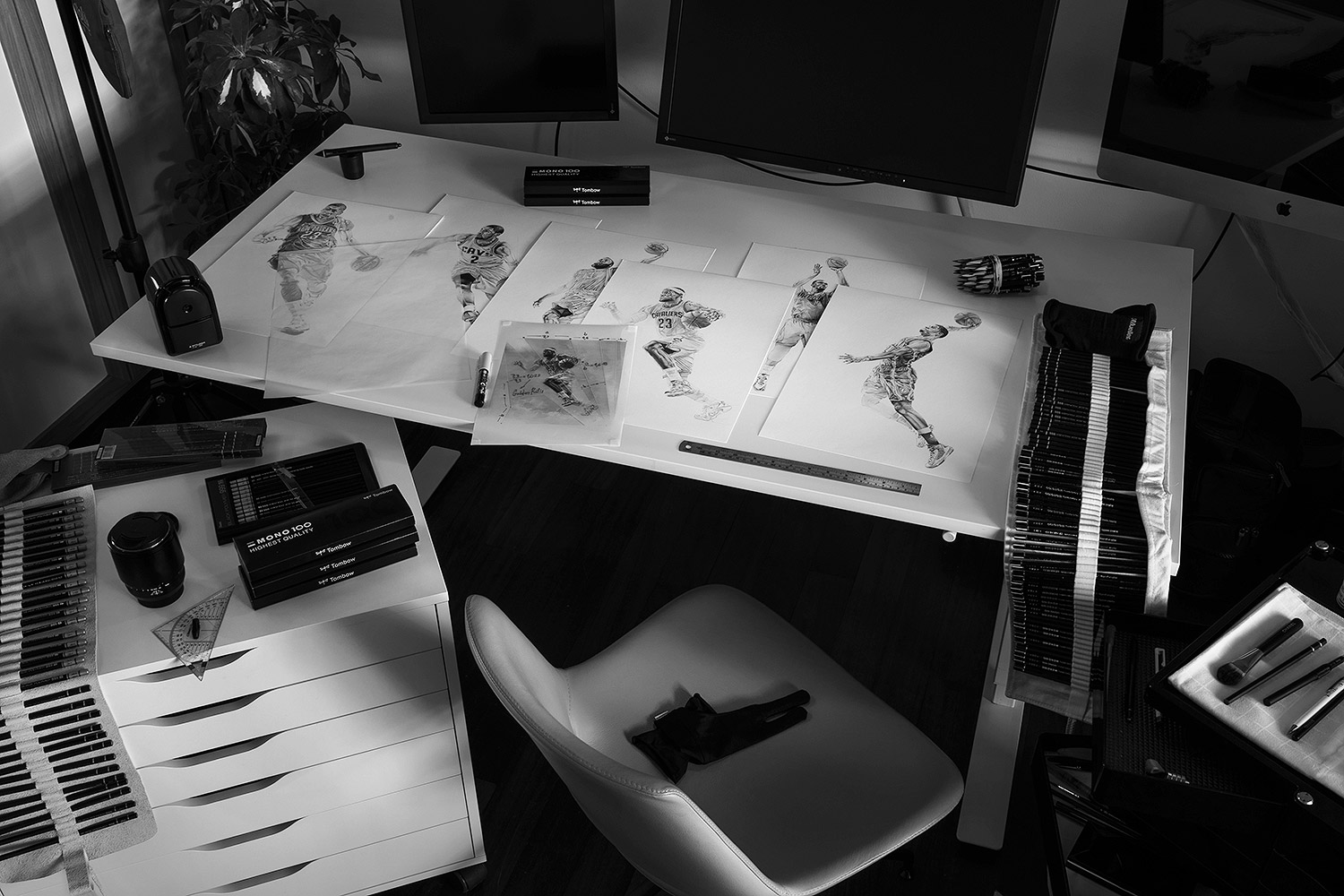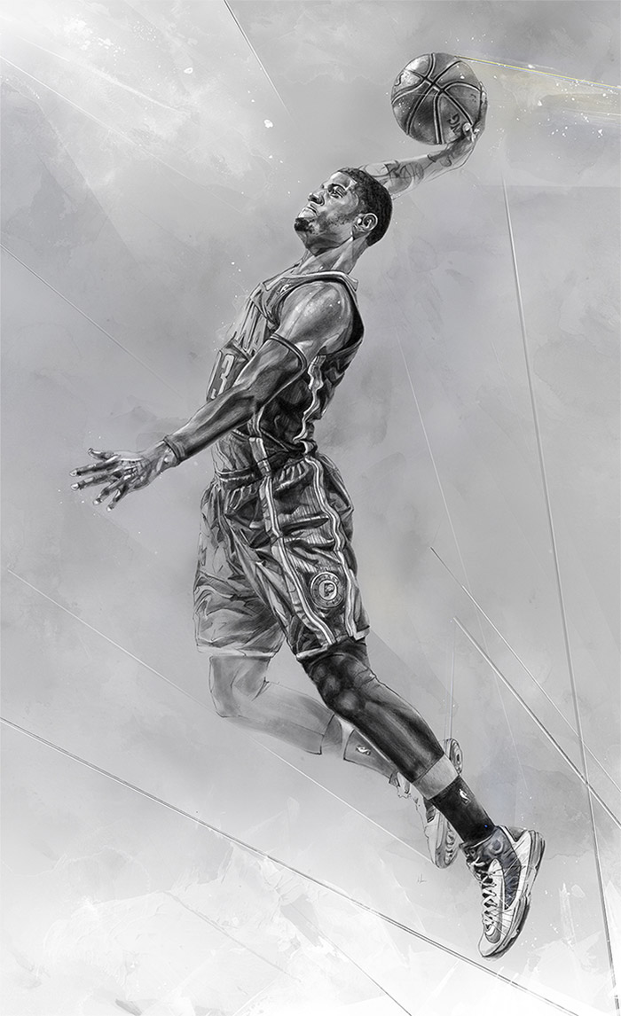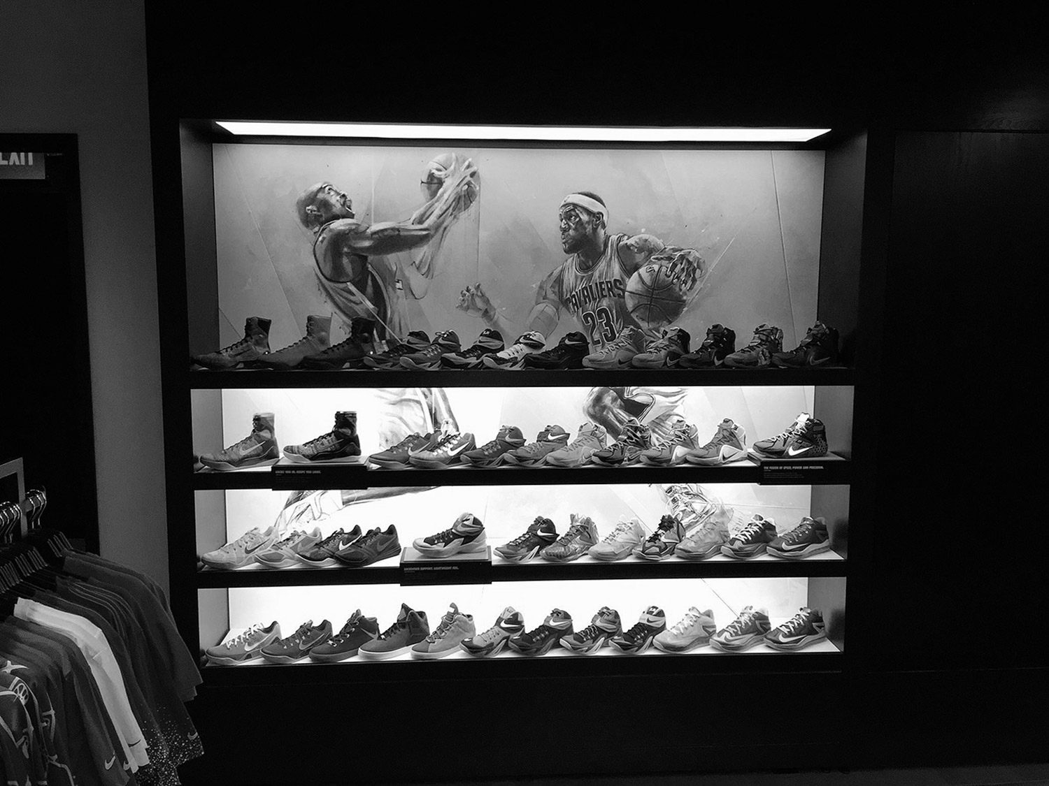 Updated designs for House of Hoops stores around the globe. Designed 6 new athlete illustrations for Nike's footwear wall graphics. House Of Hoops is a basketball-themed concept from Nike and Footlocker featuring technology to help consumers color coordinate their footwear and apparel and customize T-shirts.